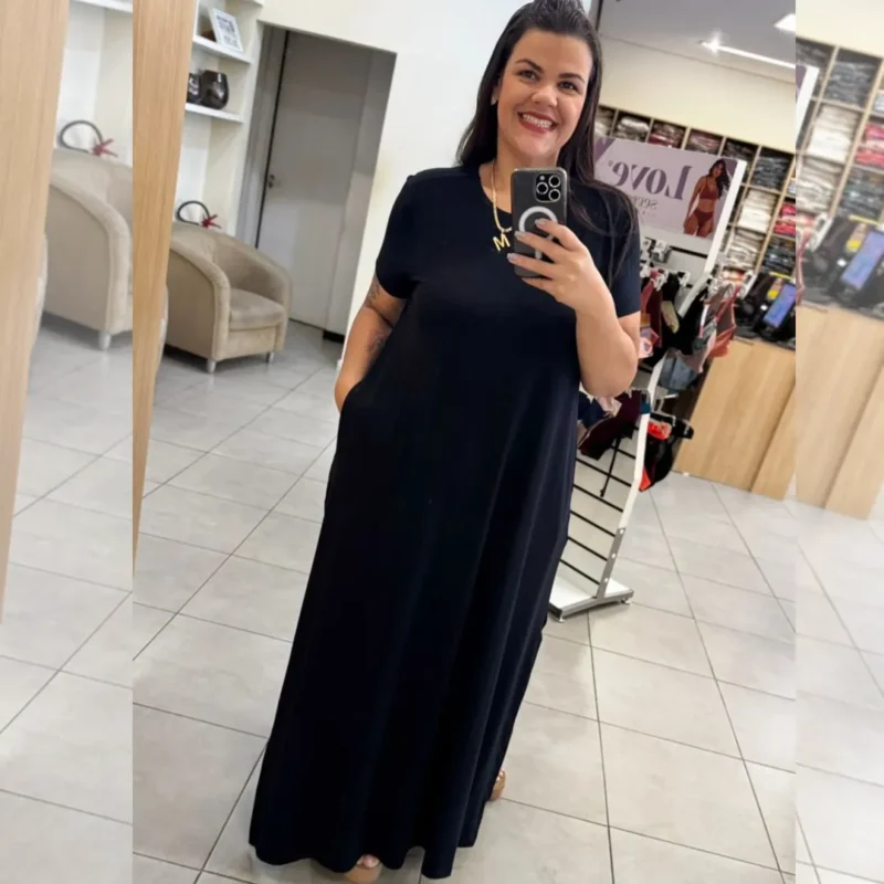 Vestido Longo Manga Curta Plus Size Ref VLM-222 Preto LUNA