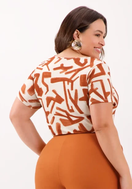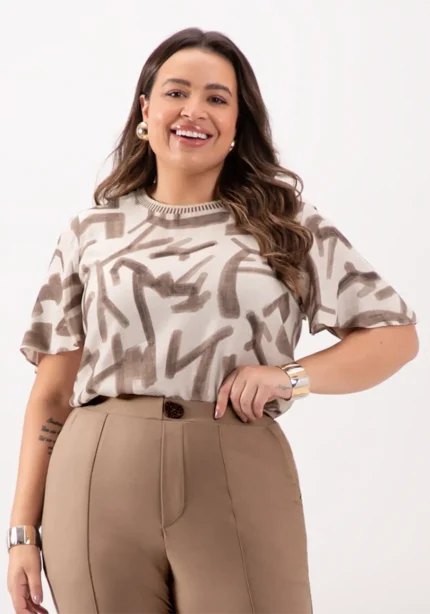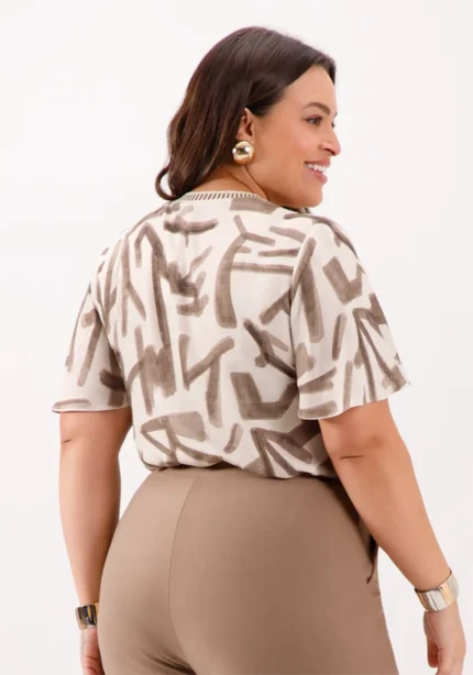 Blusa Feminina Plus Size Manga Curta Ref 69167 Estampa Bege