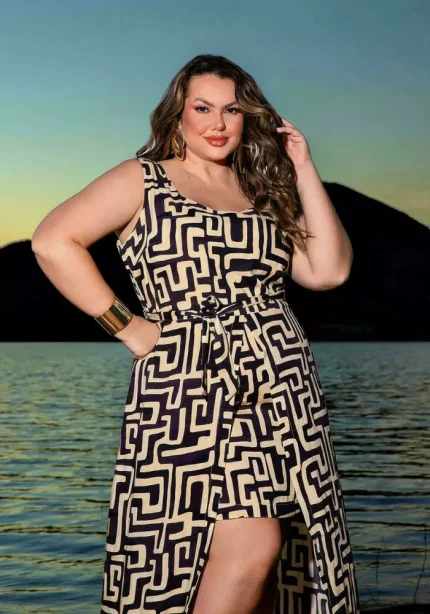 Vestido Longo Sem Manga Plus Size Ref 900829 Bege Preto GABI