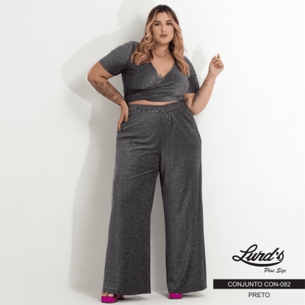 Conjunto Feminino Plus Size Pantalona + Cropped Manga Curta Ref. CON-082 Preto