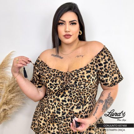 Conjunto Feminino Plus Size Cropped + Shorts Saia Oncinha Ref. 657468