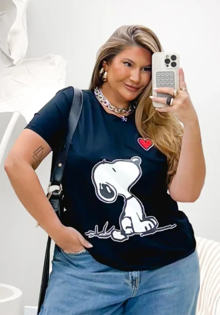 T-Shirt Feminina Plus Size Manga Curta Ref SNOOPY-001 Preto LEDA