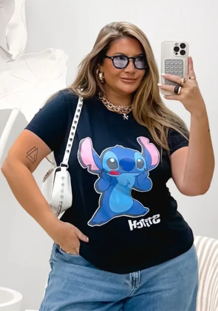T-Shirt Feminina Plus Size Manga Curta STITCH-004 Preto ANA