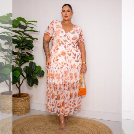 Vestido Plus Size Manga Curta Estampa Ref 12525 Bege Caramelo
