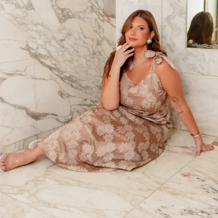 Vestido Plus Size Manga Curta Estampa Ref 12525 Bege Caramelo