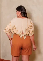Nas costas, o detalhe com abertura central e amarração ajustável traz um toque moderno e charmoso, além de garantir um caimento impecável. A modelagem é levemente mais curta, o que a torna ideal para usar por dentro de calças e shorts de cintura alta, valorizando a silhueta.