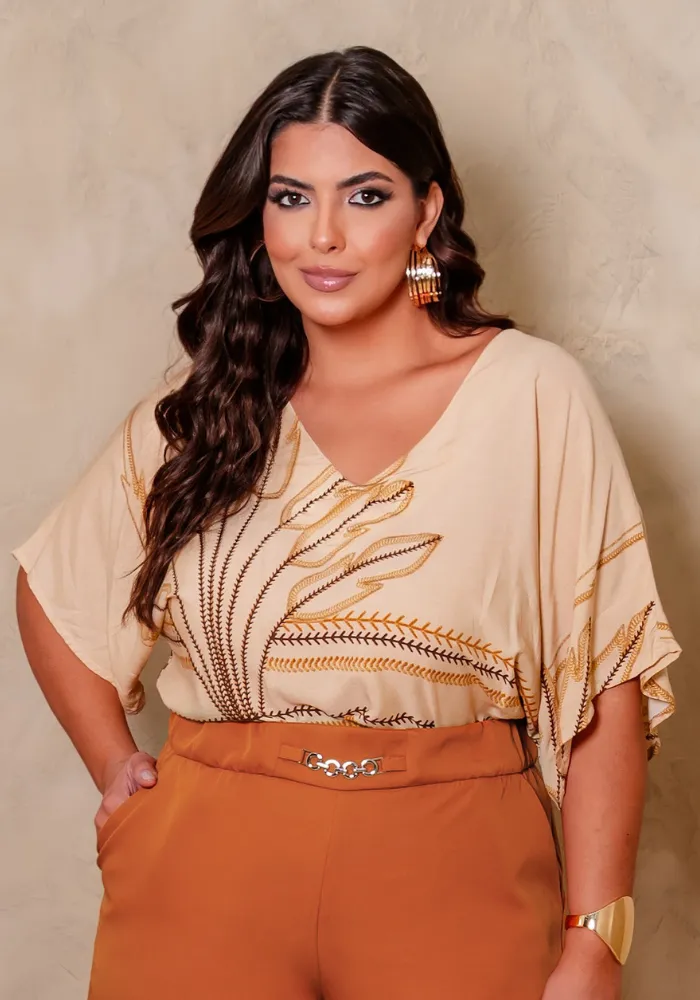 Realce seu visual com leveza e elegância! A blusa plus size Ref 700866 é confeccionada em tecido de viscose leve e confortável, ideal para os dias mais quentes. O modelo conta com mangas amplas e uma linda estampa com inspiração natural em tons terrosos, perfeita para valorizar todos os tipos de corpo.