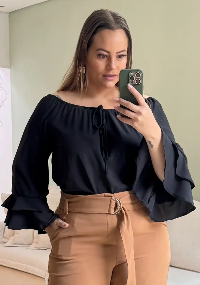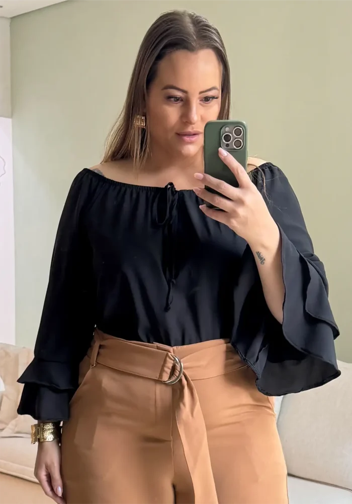 O tom preto é um clássico atemporal que combina com tudo — calças jeans, pantalonas, saias ou até aquele conjunto comfy fashion que a gente ama!