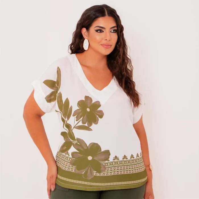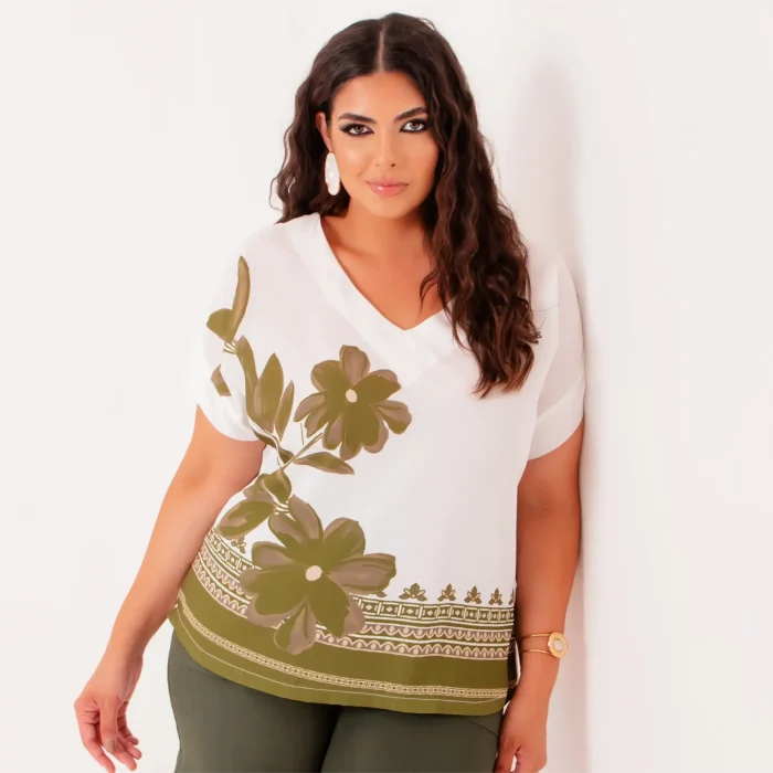 A blusa feminina plus size é a peça perfeita para compor looks modernos e elegantes. Com uma estampa delicada de flores verdes sobre fundo off-white, traz sofisticação e frescor para o dia a dia.