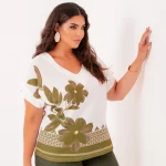 Blusa Feminina Plus Size Manga Curta Estampa Off com Flores Verdes