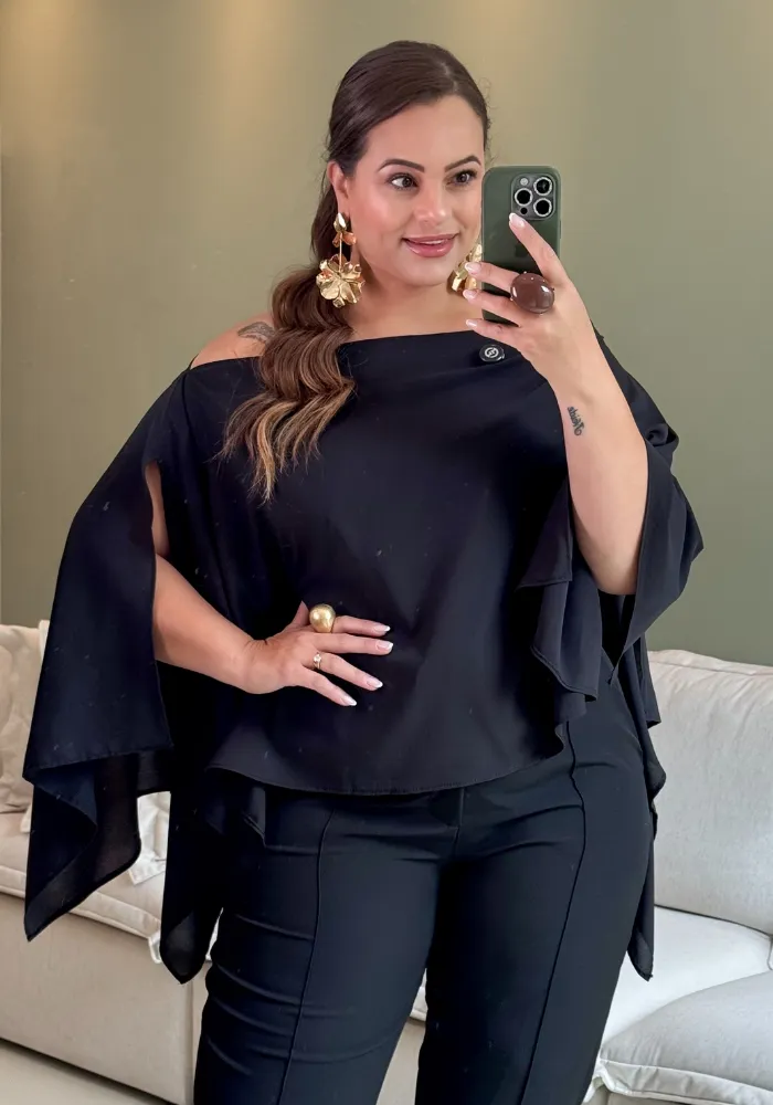 A blusa capa é uma peça coringa, perfeita para transformar qualquer look com muita elegância. Confeccionada em tecido chiffon de alta qualidade, essa sobreposição possui textura leve, toque macio e um caimento esvoaçante que valoriza todos os biotipos.