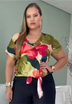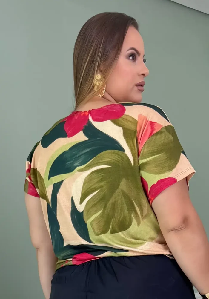 Blusa Feminina Plus Size Manga Curta Ref BMM-008 Estampa Verde