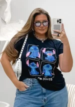 Adicione um toque divertido ao seu guarda-roupa com a nossa Blusa T-Shirt Feminina Plus Size de Manga Curta na cor preta, inspirada no icônico personagem Stitch. Com um design que captura a essência alegre e ousada do personagem, esta blusa é perfeita para quem quer expressar sua personalidade de forma leve e descontraída.