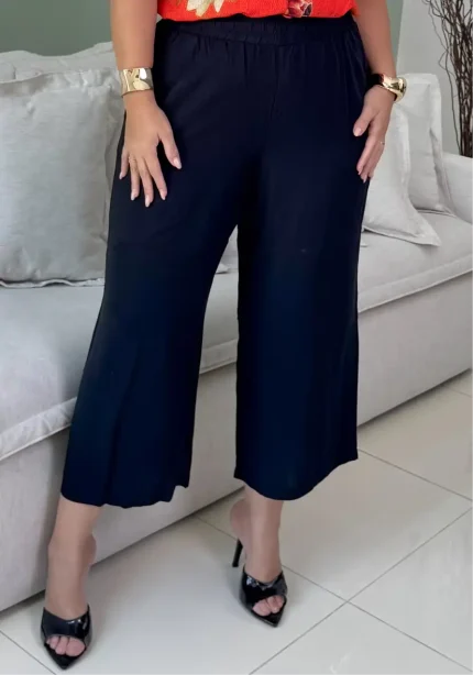 A modelagem pantacourt garante modernidade ao look, enquanto a cintura alta valoriza a silhueta. O grande diferencial está no elástico aplicado nas laterais e nas costas, que oferece ajuste perfeito ao corpo sem apertar, mantendo o conforto em todos os movimentos. O fechamento frontal em botão e zíper completa o design elegante da peça.