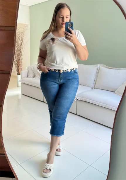 Feita em crepe de viscose, seu toque é macio e leve, proporcionando conforto o dia todo. A cintura conta com elástico na parte de trás, que se ajusta ao corpo com perfeição, sem apertar. Já o cinto no mesmo tecido com fivela dourada traz aquele charme a mais, destacando a cintura de forma elegante.