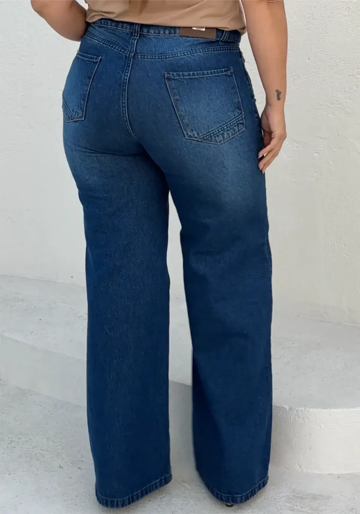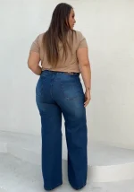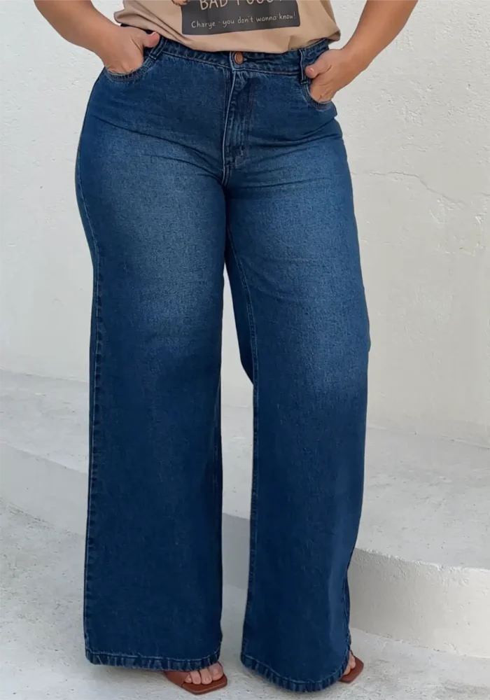 Com modelagem wide leg (pernas mais amplas do quadril até a barra), essa peça traz um ar moderno e despojado, sem perder a elegância. Perfeita pra quem busca um jeans diferenciado, que veste bem no corpo plus size e valoriza as curvas com muita atitude.