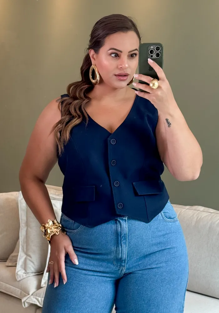 Disponível do 46 ao 54, o colete marinho é um coringa moderno e estiloso que vai elevar qualquer produção plus size.