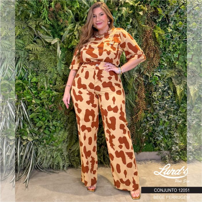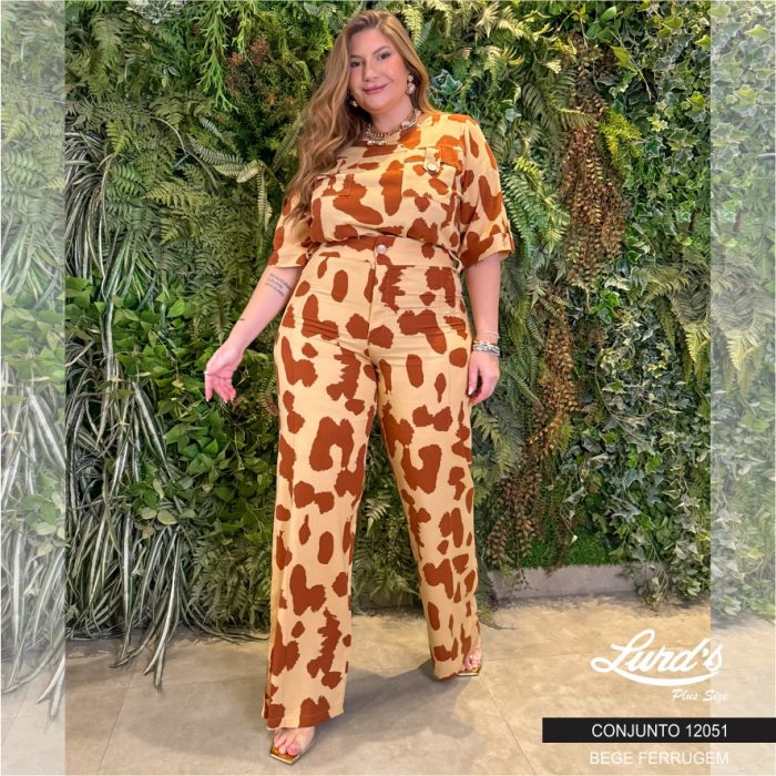 Conjunto Feminino Plus Size Blusa Manga Curta + Calça 12051 Bege Ferrugem