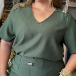 ✔ Blusa com caimento soltinho, mangas curtas e decote versátil que valoriza o colo.