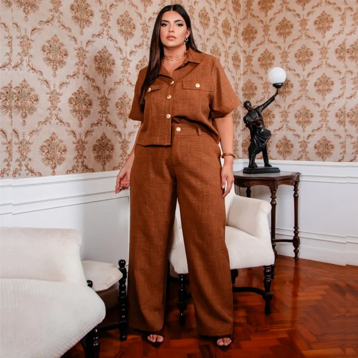 Este Conjunto Feminino Plus Size Manga Curta  + Calça Marrom é a escolha perfeita para quem busca um look prático, confortável e cheio de estilo. A blusa de manga curta com botões frontais confere um toque moderno e elegante, ideal para diversas ocasiões. A calça marrom, com seu corte impecável, oferece um caimento perfeito e combina conforto com sofisticação.