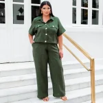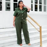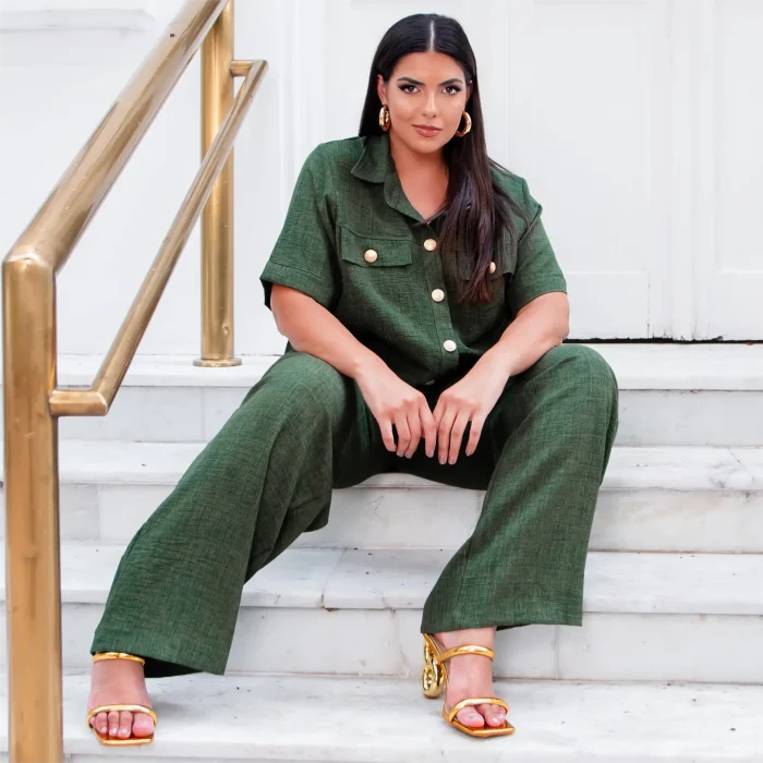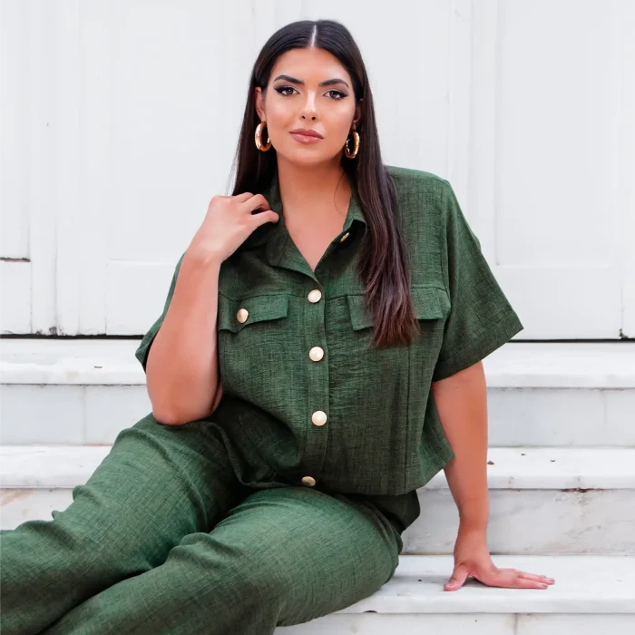Este Conjunto Feminino Plus Size Manga Curta + Calça Verde é a escolha perfeita para quem busca um look prático, confortável e cheio de estilo. A blusa de manga curta com botões frontais confere um toque moderno e elegante, ideal para diversas ocasiões. A calça marrom, com seu corte impecável, oferece um caimento perfeito e combina conforto com sofisticação.