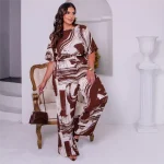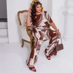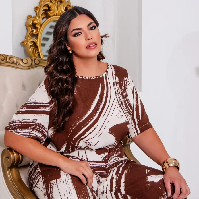 Este conjunto feminino plus size é a escolha perfeita para quem busca conforto e estilo. A blusa de manga curta apresenta uma estampa sofisticada em tons de marrom, que combina versatilidade e elegância. O tecido viscose garante leveza e respirabilidade, proporcionando um toque suave ao corpo.