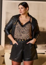 A jaqueta plus size preta em couro ecológico é a escolha ideal para quem busca sofisticação e atitude em uma única peça! Atemporal e versátil, o modelo possui acabamento impecável e caimento estruturado, proporcionando elegância em todas as ocasiões.