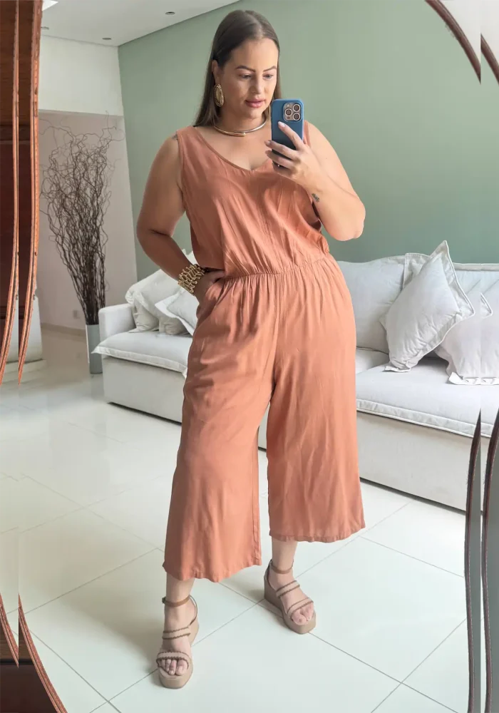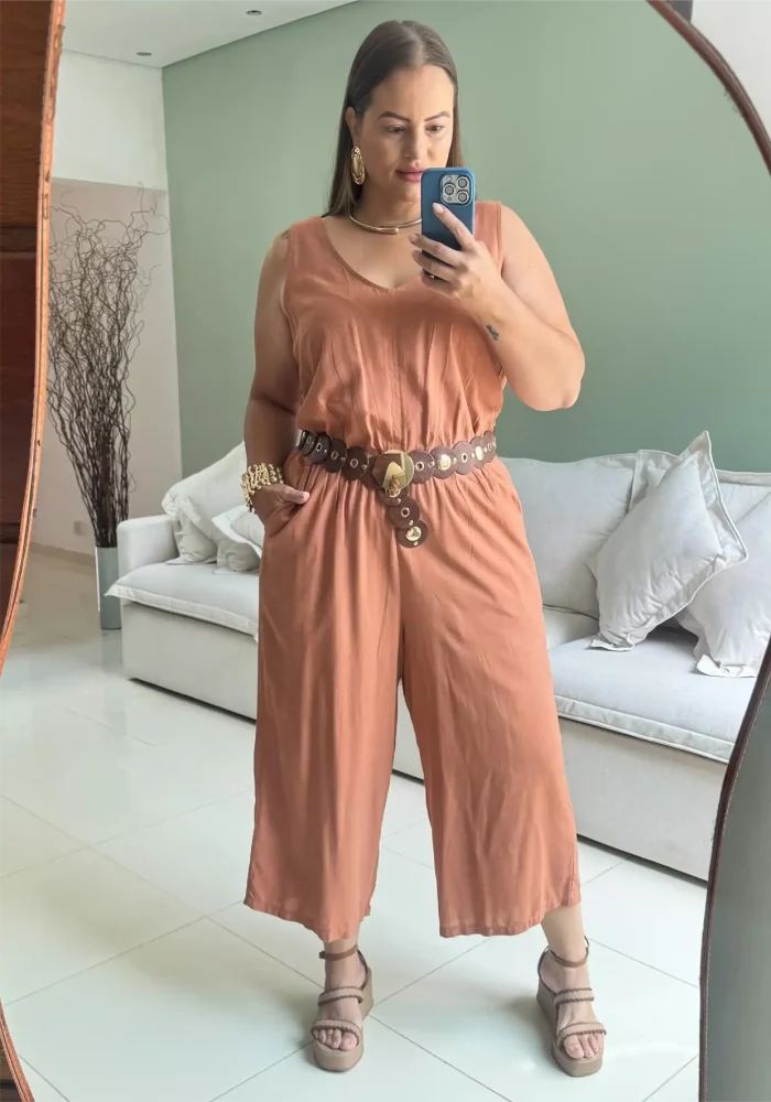 Macacão Pantacourt Feminino Plus Size Sem Manga Ref 207281 Marrom
