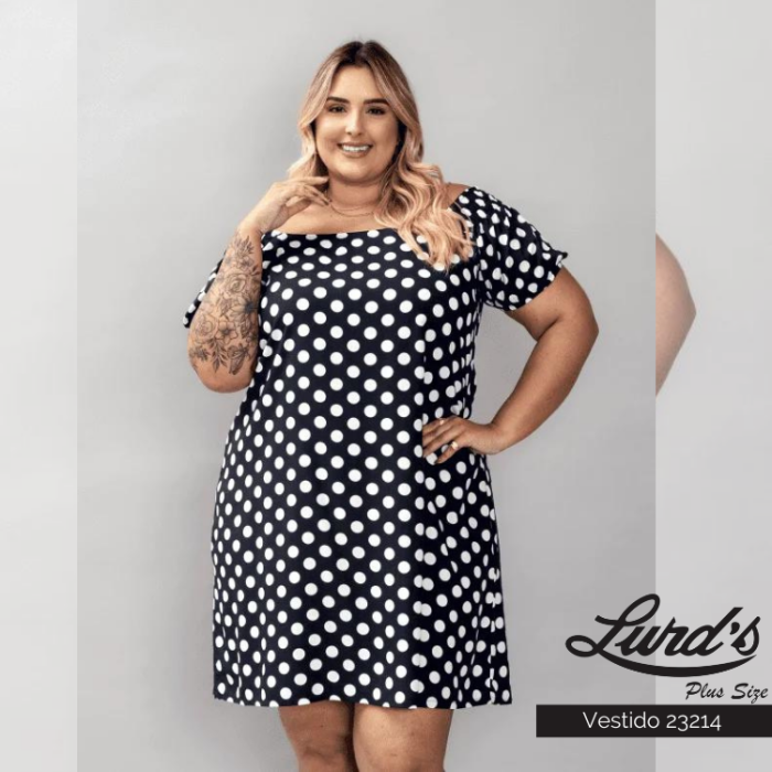 Vestido Curto Plus Size Manga Curta Ref VMM-23214 Poá Marinho