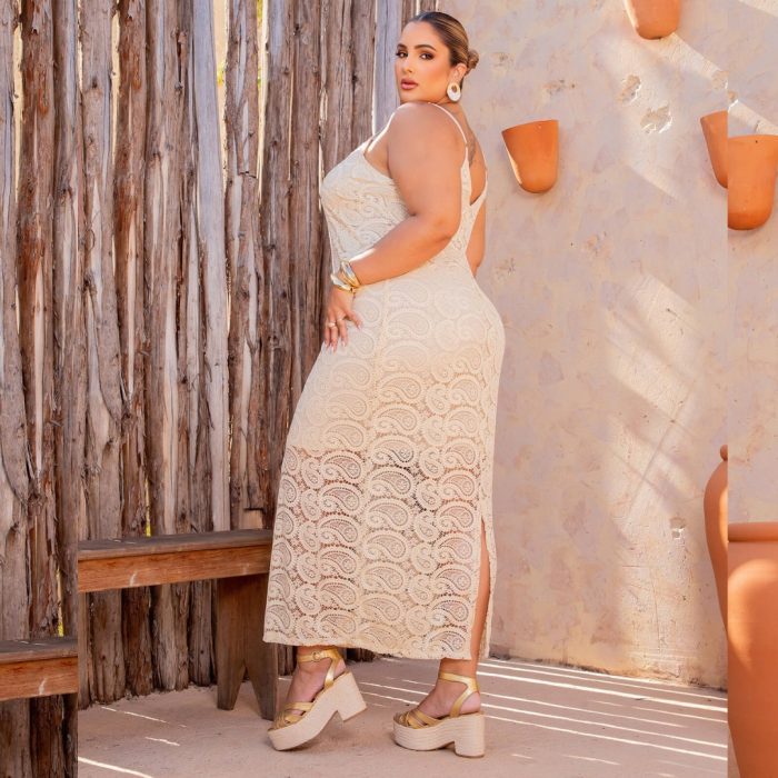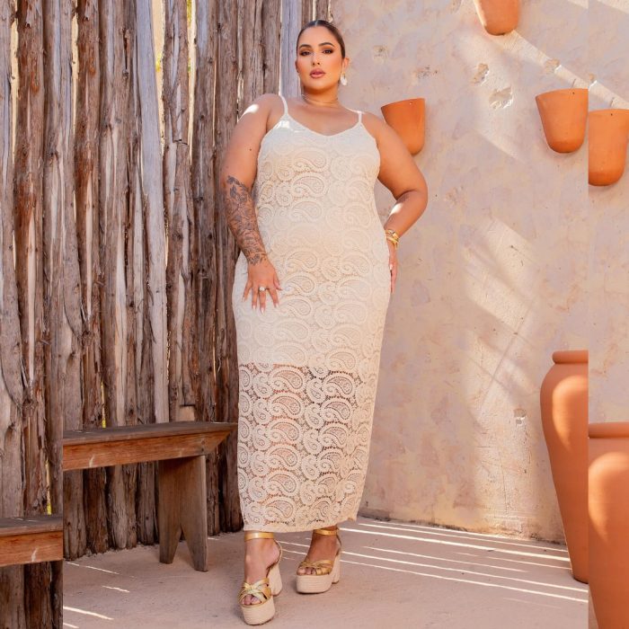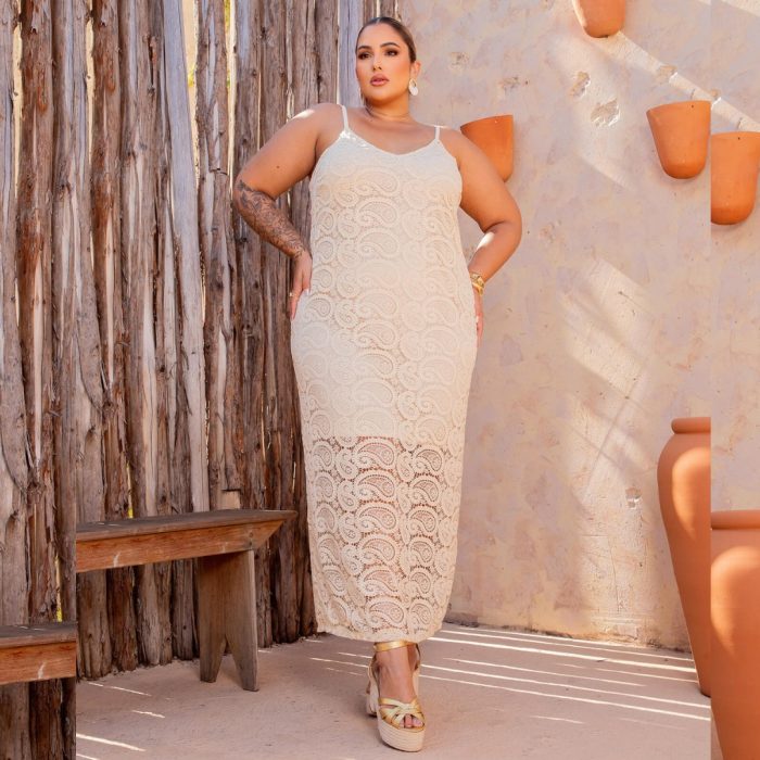 Adicione um toque de delicadeza e sofisticação ao seu guarda-roupa com o Vestido Longo Plus Size Sem Manga Bege. Este modelo é perfeito para quem busca elegância com um toque moderno. Suas alças finas destacam os ombros, enquanto o tecido de renda confere um visual refinado e charmoso. O forro em poliéster, mais curto, cria um efeito de transparência abaixo do joelho, combinado com uma fenda traseira para um acabamento elegante e sensual.