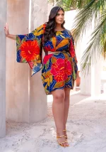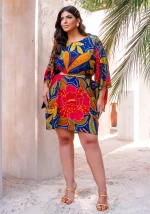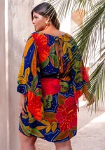 A estampa floral exuberante, em tons vibrantes de vermelho, amarelo, verde e azul, é o grande charme da peça, ideal para quem quer trazer cor e alegria para os dias mais quentes ou para eventos especiais.