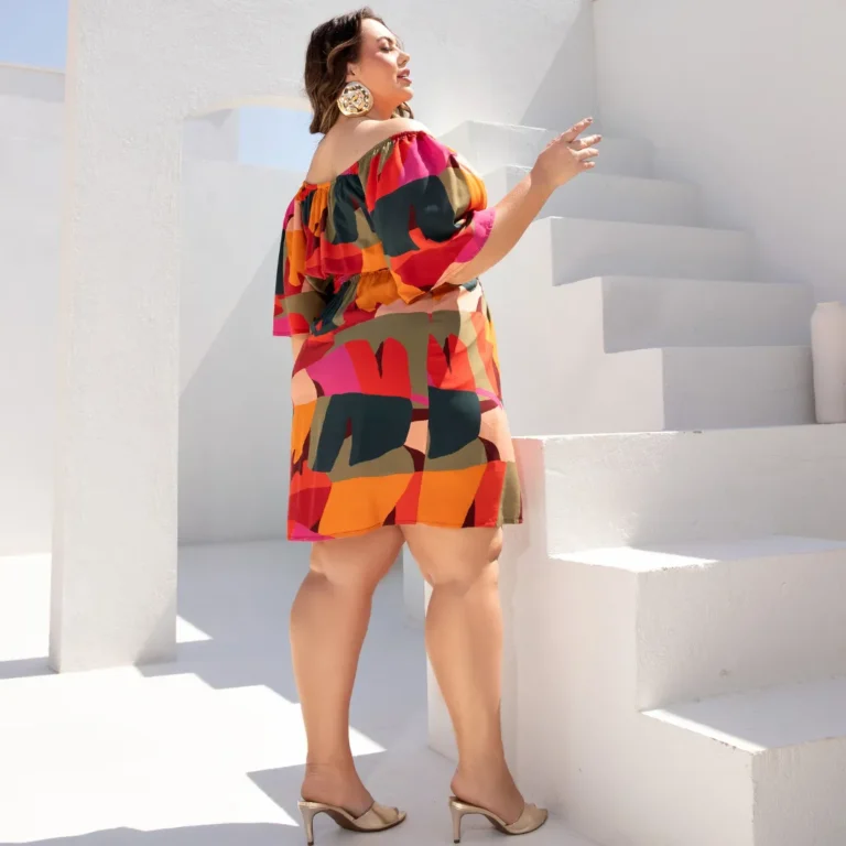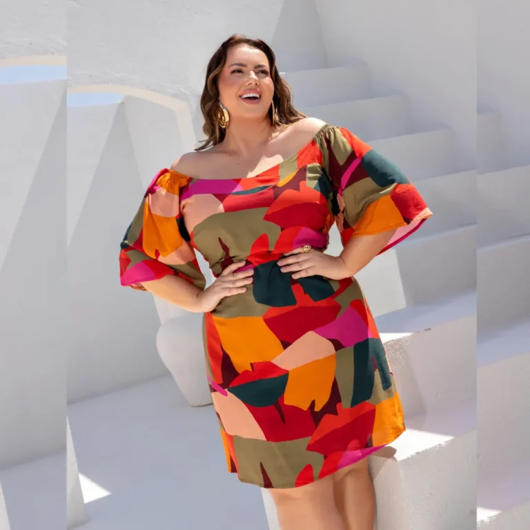 O decote arredondado dá equilíbrio à peça e o caimento fluido da viscose proporciona movimento e frescor, ideal para dias quentes ou eventos ao ar livre.
