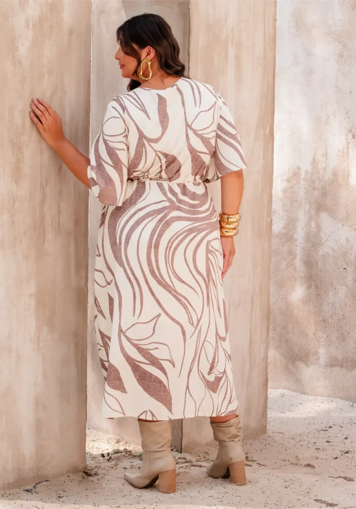 Um vestido que é puro charme e leveza! Confeccionado em viscose fresquinha, esse modelo une conforto e sofisticação na medida certa. A estampa orgânica em tons de terracota sobre o fundo off white transmite uma sensação de equilíbrio, naturalidade e elegância — ideal para mulheres que amam se vestir com personalidade e autenticidade.