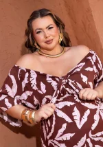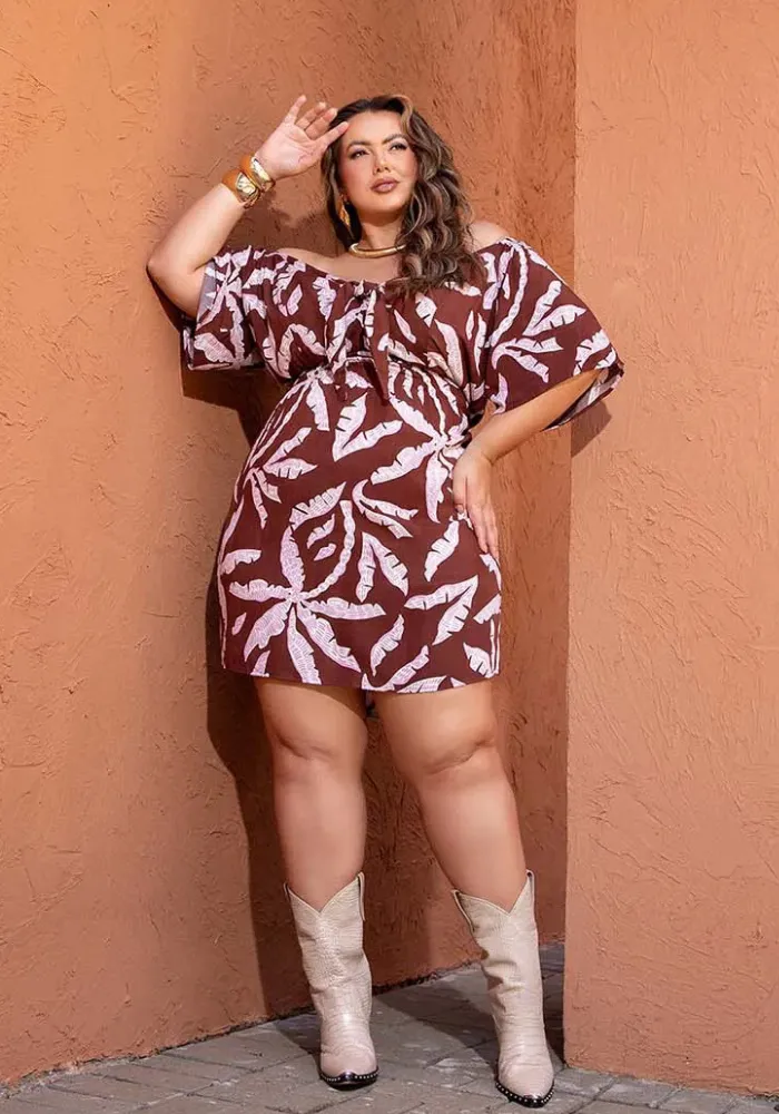 Vestido Mid Plus Size Manga Curta Estampa Areia