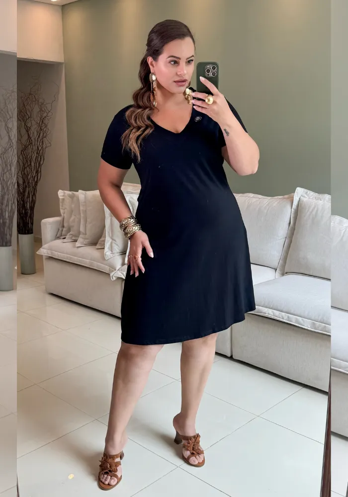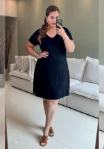 O Vestido Plus Size Manga Curta Preto é aquele clássico que não pode faltar no seu guarda-roupa! ✨